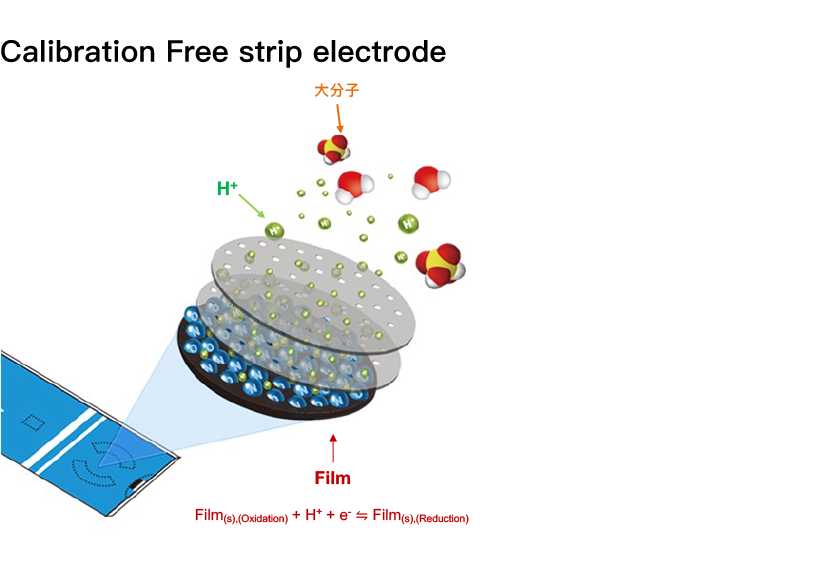 Humming Probe strip electrode modify the proton ion selective membrane at the electrode surface which having the redox reaction with proton ion, the diagram can be represented as: